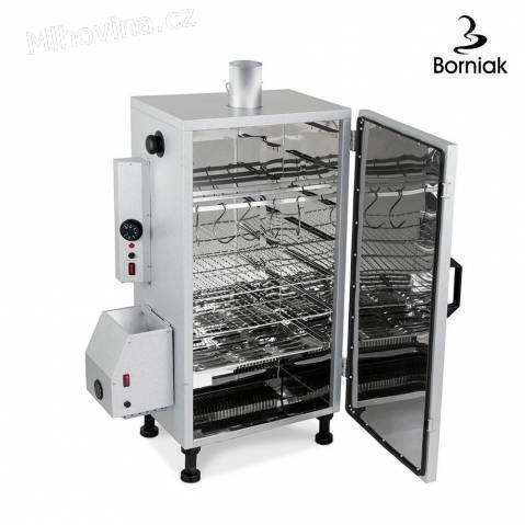 Udírna BORNIAK UW-70, objem 70l a provedení udící komory z nerezu a vnějšího pláště z pozinkovaného plechu s povrchovou úpravou (Alucynk). Udírna BORNIAK to znamená snadnost obsluhy a efektivitu procesu uzení. Z udírny Borniak získáte ty nejluxusnější sýry, ryby a uzeniny, všechny s podmanivým aroma a neopakovatelnou chutí. Všechny klíčové procesy uzení probíhají zcela automaticky, vývin kouře je zajištěn automatickým generátorem kouře se zásobníkem udící štěpky. Jak známo, správné spalování dřeva je tím, co rozhoduje o úspěchu uzení. Spalování dřevěné štěpky je zcela zautomatizováno a probíhá za specifické teploty bez plamene, kdy je dosaženo optimálních podmínek pro uzení a získání dokonalého kouřového aroma. Tato automatická udírna je pro každého - udírnu zprovozníte, naplníte zásobník dřevěnou drtí a můžete hned používat, obsluha je jednoduchá, nastavíte na termostat u teplotu v udící komoře, naplníte zásobník dřevěnou drtí a zapnete šnekový podavač této udící drtě. Udírna sestává z izolované udící komory a generátoru kouře se zásobníkem dřevěné štěpky. Udící komora je vybavena topnou spirálou a termostatem pro udržování nastavené teploty. Topná spirála a vyvíječ kouře je chráněn odkapovým tvarovaným plechem a množství kouře v udící komoře je regulováno klapkou umístěnou v komínku udírny. Izolované stěny udící komory jsou vybaveny úchyty pro udící rošty. Dveře jsou izolované s magnetickým zavíráním a těsněním. Generátor kouře plynule dodává dřevěnou drť do komory, kde dochází ke spalování a vývinu kouře. Naplněný generátor kouře vystačí až na 8 hodin vývinu kouře. Objem udírny UW-70 je 70l a lze osadit až 6-ti udícími rošty (součástí udírny je jeden rošt) na připravené úchyty, do udírny se vejde 10kg masa, výkon topné spirály je 500 W, a spirály generátoru kouře 110W, připojení do klasické zásuvky 230V, kapacita zásobníku generátoru je 2l štěpky, maximální teplota 120st.C, materiál udící komory - nerezový plech, materiál udírny plech Alucynk(pozinkovaný plech s povrchovou úpravou), vnitřní rozměry: šířka/délka/výška - 400/300/590mm, vnější rozměry: šířka/délka/výška - 625/400/1040mm, váha 17, 5kg. http://www.udirny-borniak.cz