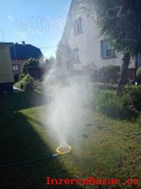 Mobilní mlhoviště. Osvěží, zavlaží, potěší. Plastová elipsa s ohniskem 336-ti vodních paprsků. Připojeno na standardní zahradní rychlospojku. Potřebný tlak 2, 5 atm. (bar). Nezanáší se vodním kamenem. Cena včetně poštovného. Mechanicky odolné, snadno skladovatelné.Spotřeba vody 15l/min - 60% oproti standardní závlaze.