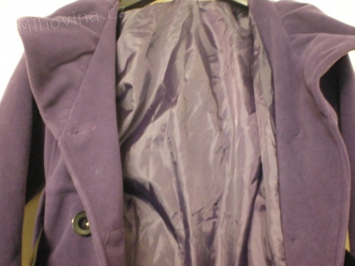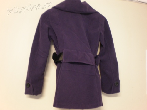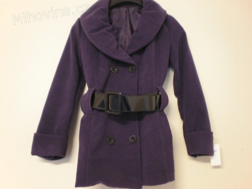 Nový fialový ¾ trenčkot s dvouřadým zapínáním, na rukávech manžety s knoflíkem. Kabát má podšívku, šálový límec a je doplněn černým širokým páskem. Materiál 100% lana, délka 70 cm, pas 90, obvod ramen 85, rukáv od ramenního švu 60.